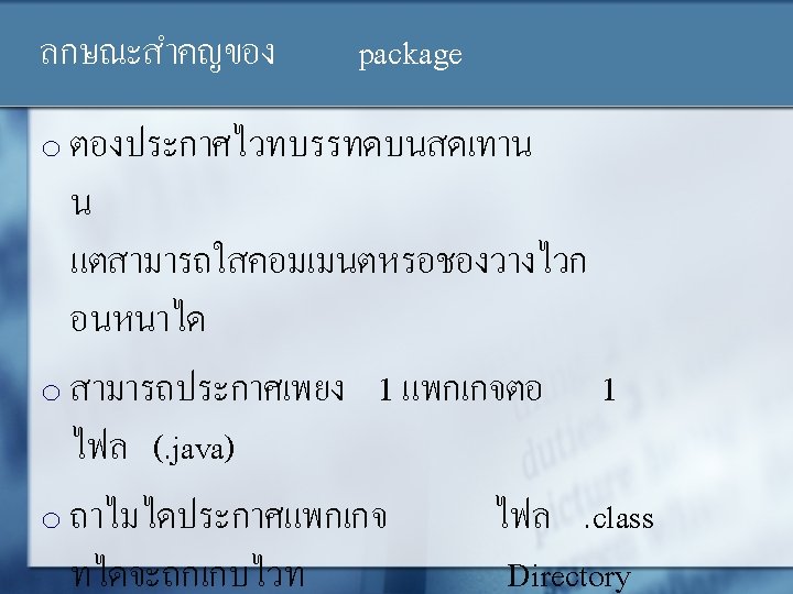 Modifier ในภาษาจาวา 1. Access modifier : เพอกำหนดระดบการเขาใชงาน ไดแก private, public, protected และ package (none หรอ default) 2. non –access modifier ไดแก final , static, abstract , native transient , volatile , synchronized , strictfp