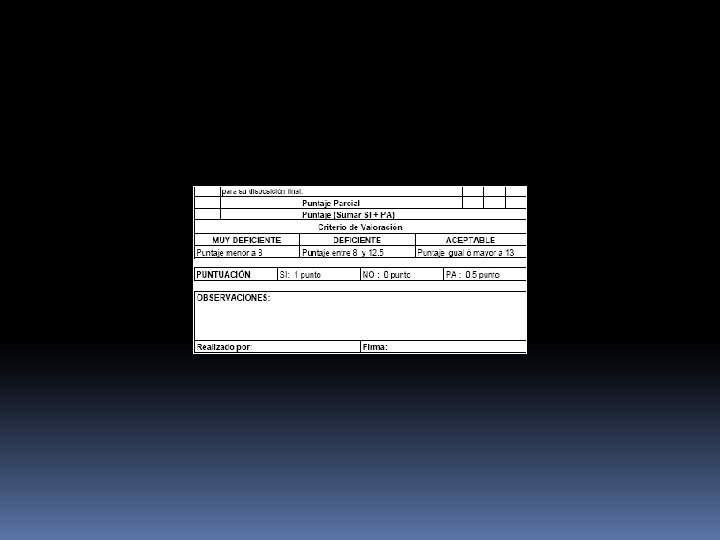 Monitoreo de verificación de procedimientos Procesos críticos Servicio Proceso de eliminación de desechos solidos Cum Cum Cumpl ple ple ple e Si/No Si/No Si/No 1 2 3 4 5 6 7 8 9 10 11 12 Admi Topic Caja Cons Odon Farm Labor Sala Intern Establ sión o SIS ult. tol acia at de amie ecimie Emer Medi Mujer Niño parto nto g co Si Si Si Si No Si Si Si No P 3: Transporte interno según norma NA NA NA No P 4: Procedimiento de almacenamiento intermedio, NA NA NA NA NA NA Si NA NA NA Si P 1: Procedimiento de acondicionamiento, , P 2: Procedimento de segregacion (almacenamiento primario): Recipientes rígidos cerrados y rotulados para punzocortantes, bolsas de polietileno rojo para biocontaminado y de polietileno negro para residuos comunes P 5: Tratamiento de biocontaminados, especiales y punzocortantes P 6: Almacenamiento final Total cumple Total No cumple % de cumplimiento optimo 2 2 1 2 2 2 0 0 1 0 0 0 100. 0 50. 0 100. 0 80. 0 4 2 66. 7 80. 0