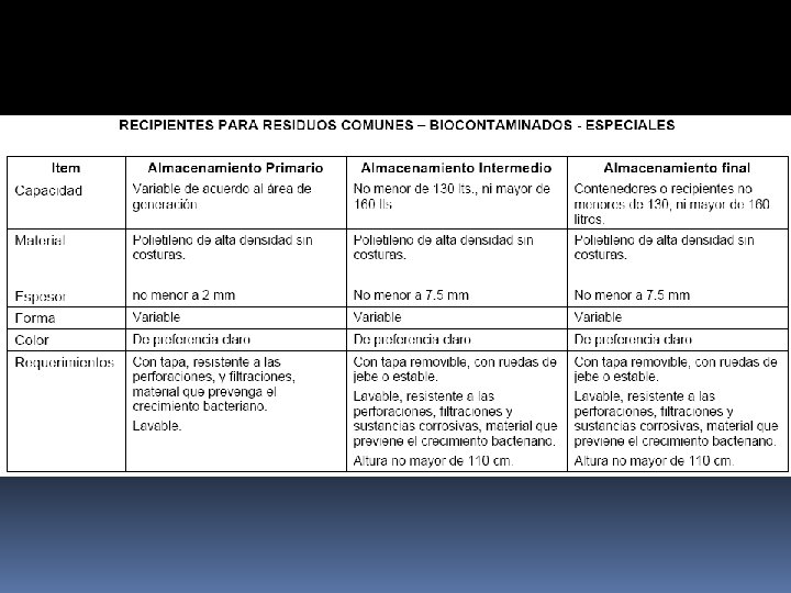 Lista de ambientes para acondicionamiento para eliminación de residuos sólidos Ambiente Requerimiento Admisión-archivo-triaje 1 recipiente con tapa, bolsa negra Tópico emergencia 2 recipientes con tapa, Bolsa roja, bolsa negra Caja-SIS-Asistencia social 1 recipiente con tapa, bolsa negra Consultorio médico 2 recipientes con tapa, bolsa roja, bolsa negra Consultorio Mujer 2 recipientes con tapa, bolsa roja, bolsa negra Consultorio Niño 2 recipientes con tapa, bolsa roja, bolsa negra Consultorio Odontológico 2 recipientes con tapa, bolsa roja, bolsa negra Farmacia 2 recipientes con tapa, bolsa amarillo, bolsa negra Laboratorio 3 recipientes con tapa, bolsa roja, bolsa amarilla, bolsa negra Sala de Parto 2 recipientes con tapa, bolsa roja, bolsa negra Internamiento 2 recipientes con tapa, bolsa roja, bolsa negra