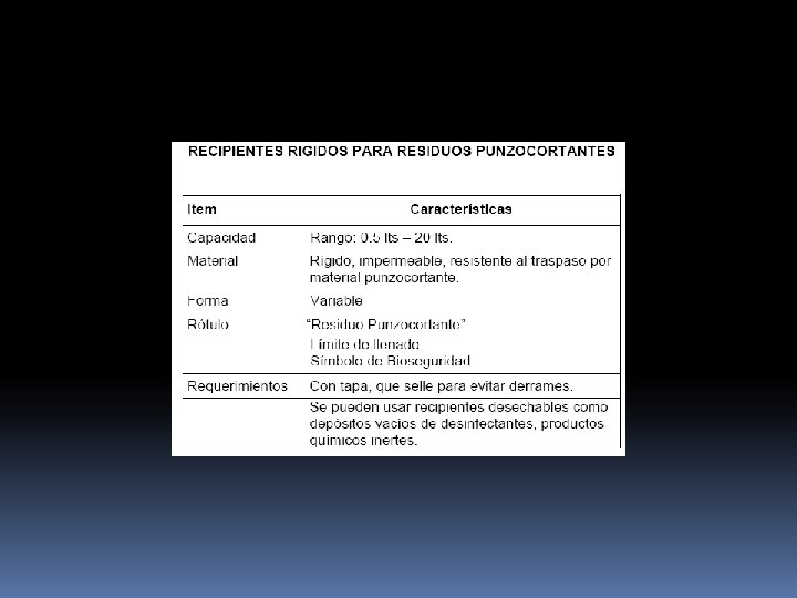 TIPOS DE RESIDUOS SÓLIDOS Atención al paciente Residuo biocontaminado Residuo especiales Residuo común secreciones, excresiones, organicos y restos de alimentos líquidos Material biológico Cultivos, inóculos, mezcla de microorganismos, medio de cultivo inoculado, vacuna vencida o inutilizada, catéteres, filtros de equipo biomédico, Punzocortantes Agujas hipodérmicas, pipetas, bisturí, placas de cultivo, agujas de sutura, catéteres de agujas, pipetas de vidrios rotas, etc. Químicos peligrosos Recipientes contaminados por corrsivos, inflamables, reactivos, , plaguicidas, soventes, ácido crómico, mercurio de termómetros, aeites, lubricantes etc. Medicamentos vencidos, contaminados, desactualizados, no utlizados Rsidhos domésticos (papeles, cartones, cajas, plásticos, restos de preparación de alimentos, etc)