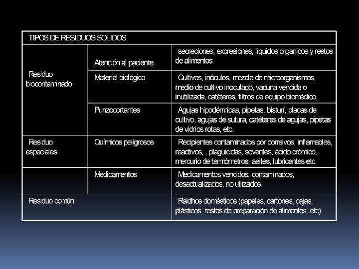 DEFINICIONES Residuos sólidos hospitalarios: son aquellos desechos generados en los procesos y en las actividades de atención e investigación médica en los establecimientos como hospitales, clínicas, postas, laboratorios y otros Segregación y almacenamiento primario: separación en el punto de generación, de los residuos sólidos ubicándolos de acuerdo a su tipo en el recipiente (almacenamiento primario) correspondiente Almacenamiento intermedio: Es el lugar ó ambiente en donde se acopian temporalmente los residuos generados por las diferentes fuentes de los servicios cercanos Almacenamiento Final: Los residuos son depositados temporalmente para su tratamiento y disposición final en el relleno sanitario. Tratamiento de los residuos: consiste en transformar las características físicas, químicas y biológicas de un residuo peligroso en un residuo no peligroso o bien menos peligroso