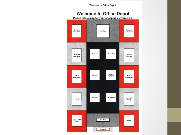 Retail Store Flow Guidelines • “Prisoner” aisles make you enter store in a particular route, and pass by certain displays • Often contain less profitable (for the store) brands • “Decompression Zone” people walk past first rows of items before settling into shopping mode.