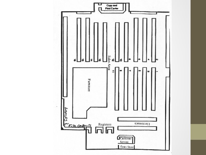 Retail/Service Layout • Design maximizes product exposure to customers, profitability per square foot • Decision variables • • Store flow pattern Allocation of (shelf) space to products • Types • • Grid design Free-flow design Video