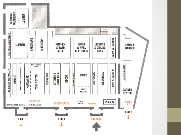 Retail Store Flow Guidelines • Frequently purchased items at far sides of stores so you have to go through entire store (produce or meat). • Profitable sections like produce placed where you keep running into them Meat Milk Produce