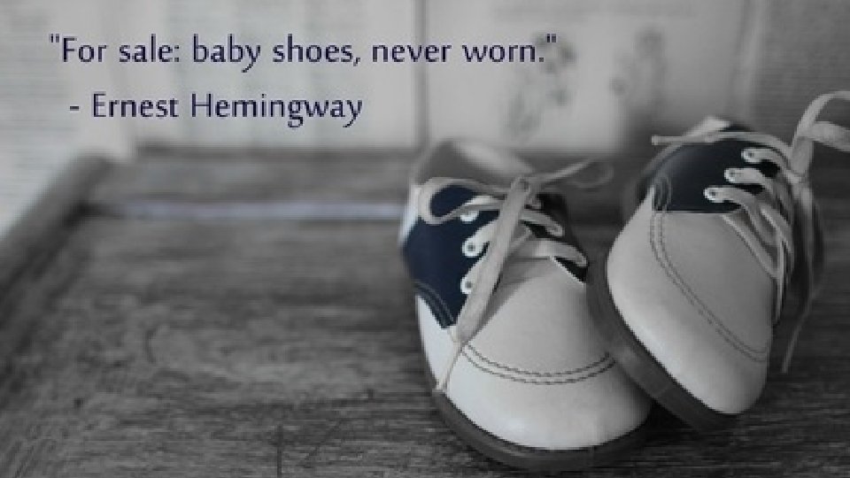 WHAT DO YOU THINK? Literary legend has it that, famous author, Ernest Hemingway was once challenged to write a novel with six words. This is what he came up with, "For sale, baby shoes, never worn. " Wow! What a tale. Can you fill in the blanks? What could this extremely short story mean? Is it a sad story? Could it be happy? Who is the baby? Why were the shoes never worn? Who were the parents? Why were the selling the shoes? Take 5 minutes to write what you think Hemingway meant when he wrote this story?