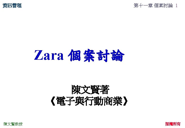 資訊管理 第十一章 個案討論 6 ZARA IT for Fast Fashion Introduction 陳文賢教授 Business model Strategy IT 版權所有