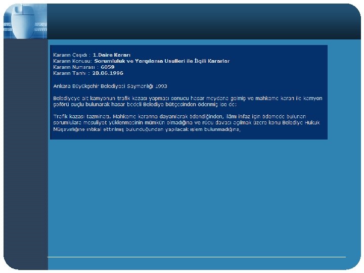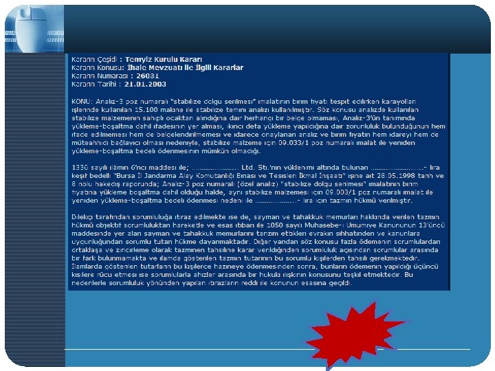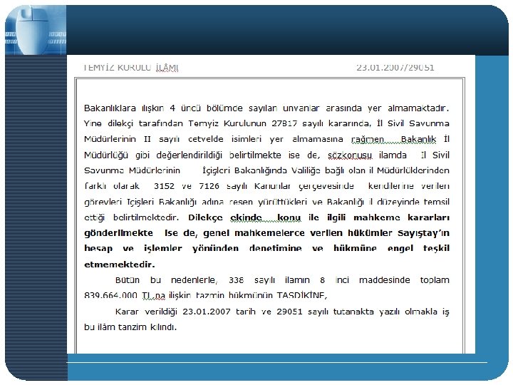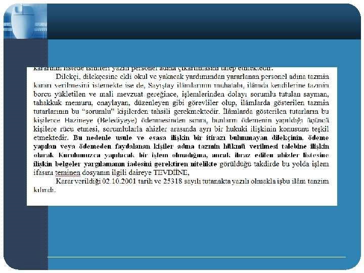 AÇIKLAMA VE DÜZELTME İSTEMİ q Sayıştay dairelerinden veya Temyiz Kurulundan verilen kararlar müphem ise taraflardan her biri bunların tavzihini yahut tarafların adı ve soyadı ile sıfatı ve iddiaların sonucuna ilişkin yanlışlıklar ile hüküm fıkrasındaki hesap yanlışlıklarının düzeltilmesini isteyebilir. q Tavzih veya düzeltme dilekçeleri karşı taraf sayısından bir nüsha fazlasıyla verilir. q Kararı vermiş olan daire veya Kurul işi inceler ve lüzum görürse dilekçenin bir nüshasını, tayin edeceği süre içerisinde cevap verilmek üzere, diğer tarafa tebliğ eder. Cevap iki nüsha olarak verilir; bunlardan biri tavzih veya düzeltmeyi isteyen tarafa gönderilir. q Görevli daire veya Kurulun bu husustaki kararı taraflara tebliğ olunur. q Tavzih veya düzeltme, kararın yerine getirilmesine kadar istenebilir.
