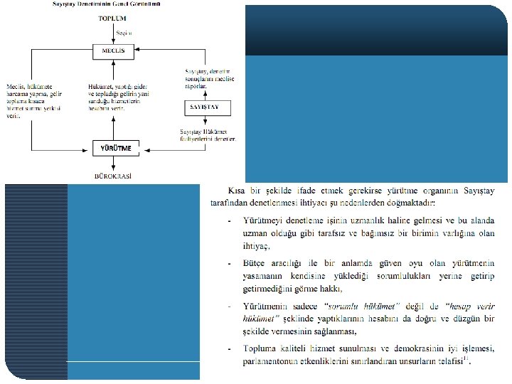 SAYIŞTAY HAKKINDA GENEL BİLGİLER Sayıştay’a, 5018 sayılı Kanun ile birçok fonksiyon verilmiştir. q Merkezî yönetim kapsamındaki kamu idareleri ve sosyal güvenlik kurumları, idare faaliyet raporları, q Mahallî idarelerce hazırlanan idare faaliyet raporları, İçişleri Bakanlığınca, bu raporları esas alarak kendi değerlendirmelerini de içeren mahallî idareler genel faaliyet raporunu, q Merkezî yönetim kapsamındaki idareler ile sosyal güvenlik kurumlarının bir malî yıldaki faaliyet sonuçları, Maliye Bakanlığınca hazırlanacak genel faaliyet raporunda gösterilir. Bu raporda, mahallî idarelerin malî yapılarına ilişkin genel değerlendirmelere de yer verilir. Maliye Bakanlığı da genel faaliyet raporunu, Sayıştay gönderir. Kesin hesap kanun tasarısı? ?