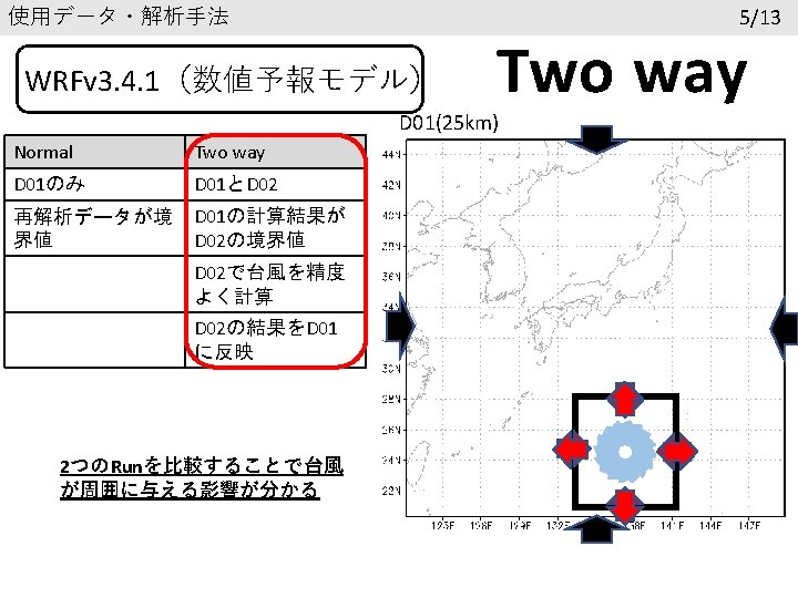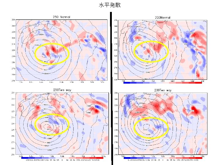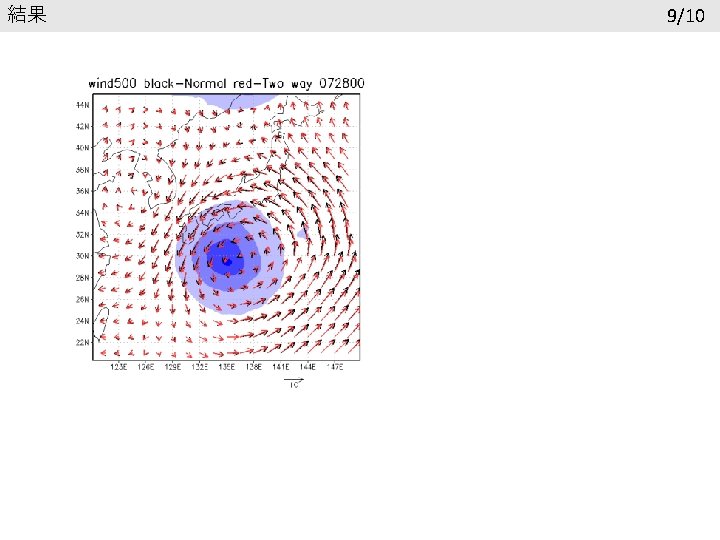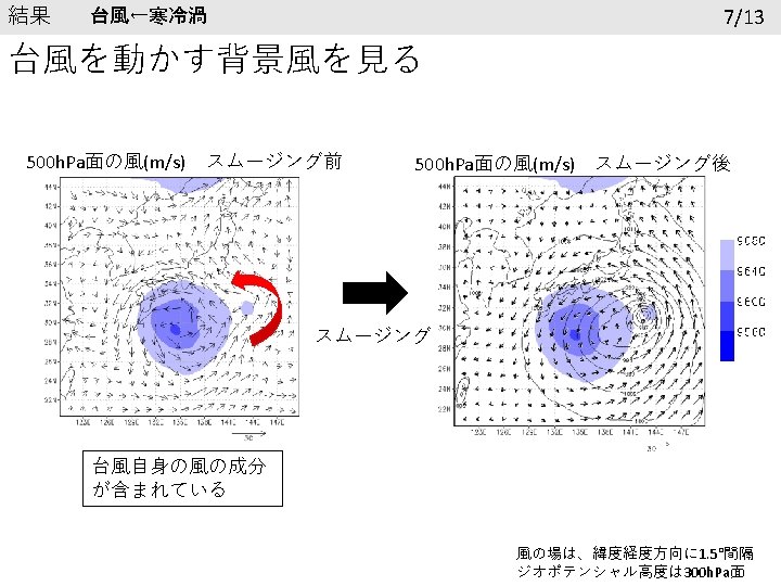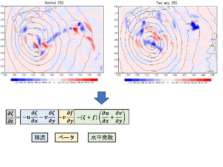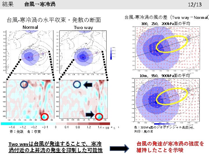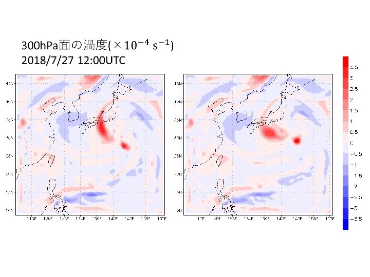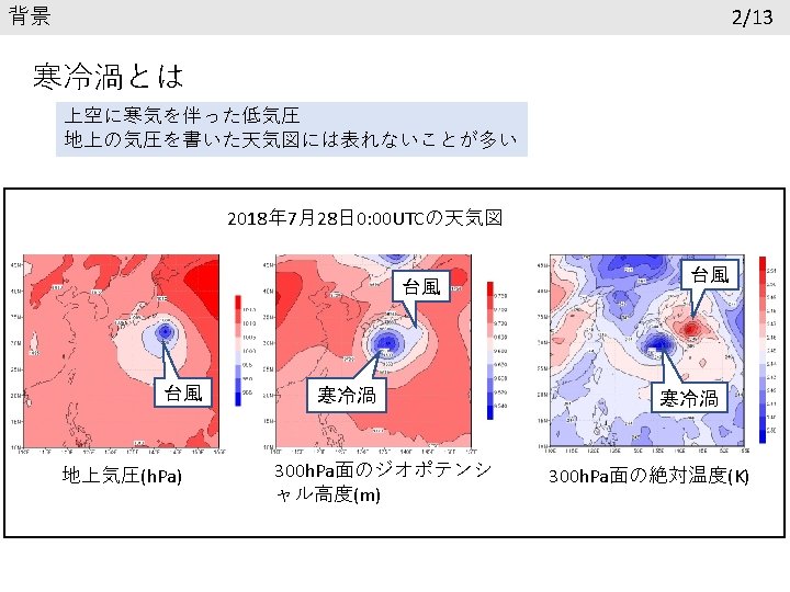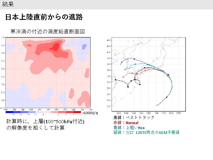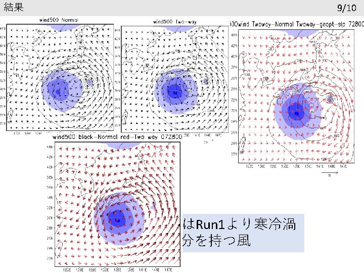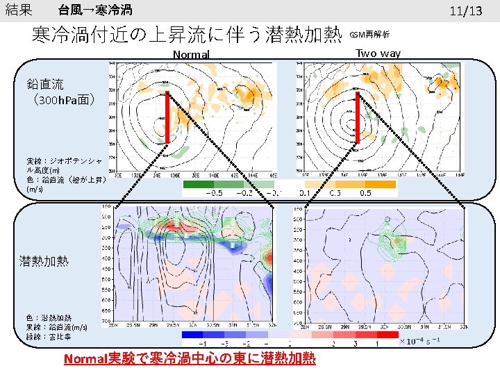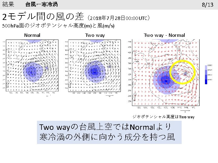 結果 再現性の確認 6/13 台風の進路 寒冷渦の進路 7/28 00 UTC 黒線:ベストトラック 赤線:Normal 青線:Two way 7/28 00 UTC 黒線:GSM 赤線:Normal 青線:Two way 7/26 0: 00以降24時間ごとに印 台風の中心気圧(h. Pa) 寒冷渦中心のジオポテンシャル高度 1005 9700 995 9650 985 9600 GSM 975 Normal Two way 965 955 945 7. 26. 2018 0: 00 GSM 9550 Normal Two way 9500 9450 7. 28. 2018 0: 00 7. 30. 2018 0: 00 8. 1. 2018 0: 00 9400 7. 26. 2018 0: 00 7. 28. 2018 0: 00 7. 30. 2018 0: 00 8. 1. 2018 0: 00
