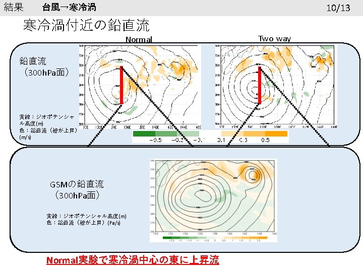 結果 Normalでの寒冷渦の衰弱 9/13 Normal実験での寒冷渦の衰退 寒冷渦中心の 300 h. Pa面の温度(℃) 寒冷渦中心の 300 h. Pa面ジオポテンシャル高度(m) 9660 -27 9640 -29 9620 9600 GSM 9580 Normal 9560 Two way GSM Normal -33 Two way -35 9540 -37 9520 9500 7. 26. 2018 0: 00 -31 7. 28. 2018 0: 00 7. 30. 2018 0: 00 -39 7. 26. 2018 0: 00 7. 28. 2018 0: 00 7. 30. 2018 0: 00 Normal実験ではジオポテンシャル高度の上昇と共に温度も上昇 Normal実験では寒冷渦の衰退が早い