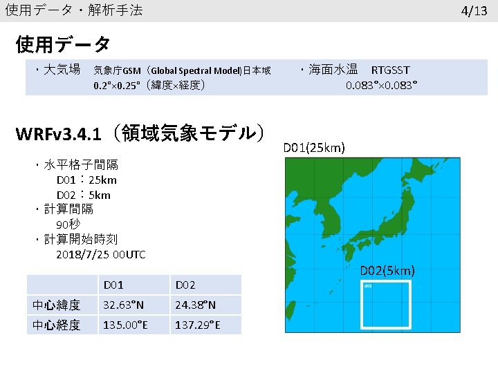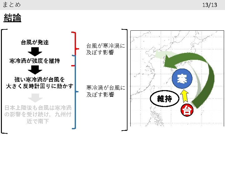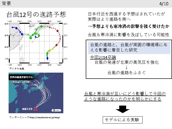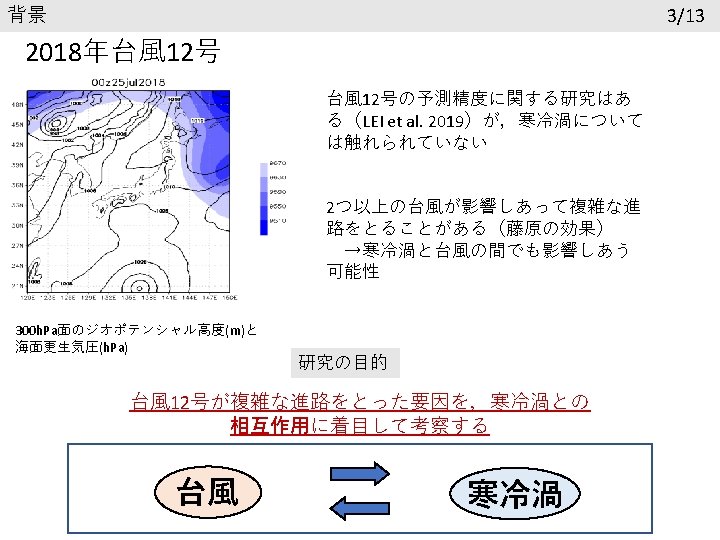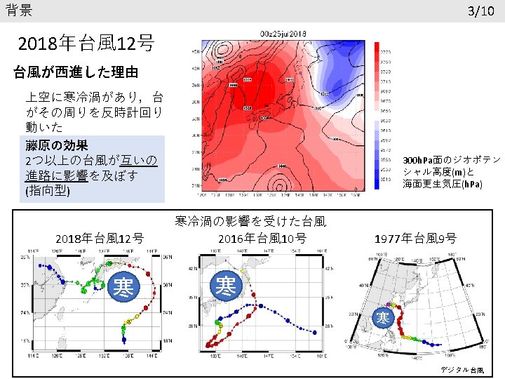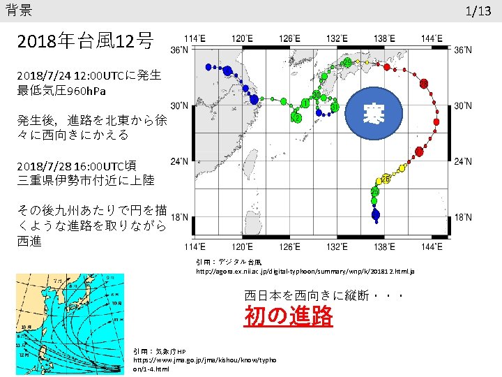 参考文献 Chan, C. L. , and R. T. Williams, 1987: Analytical and numerical studies of the beta-effect in tropical cyclone motion. Part Ⅰ: Zero mean flow. J. Atmos. Sci. , 44, 1257 -1265. Lei L, Ge Y, Tan Z, Bao X. 2020. An evaluation and improvement of tropical cyclone prediction in the western North Pacific basin from global ensemble forecasts. Science China Earth Sciences, 63: 12– 26 気象庁報道発表資料(2018年 7月27日) https: //www. jma. go. jp/jma/press/1807/27 d/kaisetsu 2018072714. pdf 気象庁台風経路図 https: //www. data. jma. go. jp/fcd/yoho/typhoon/route_map/bstv 2018. html