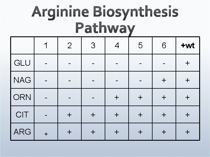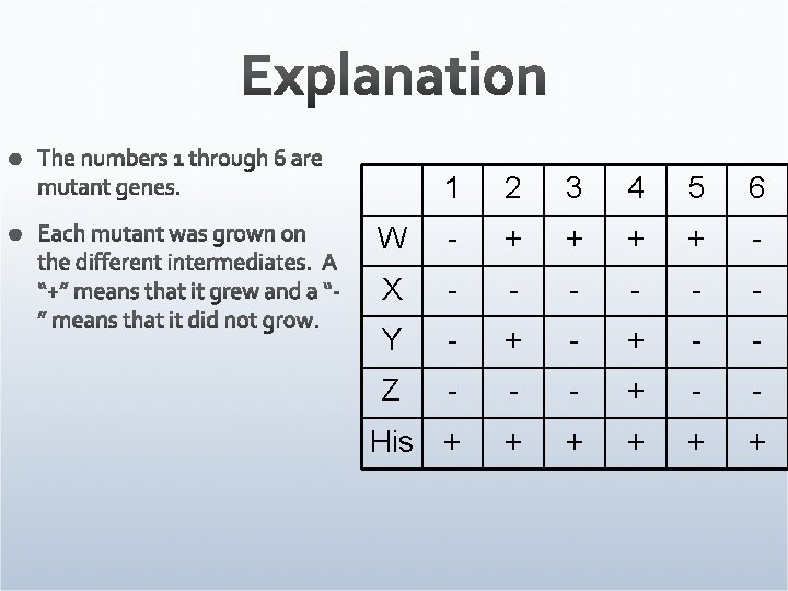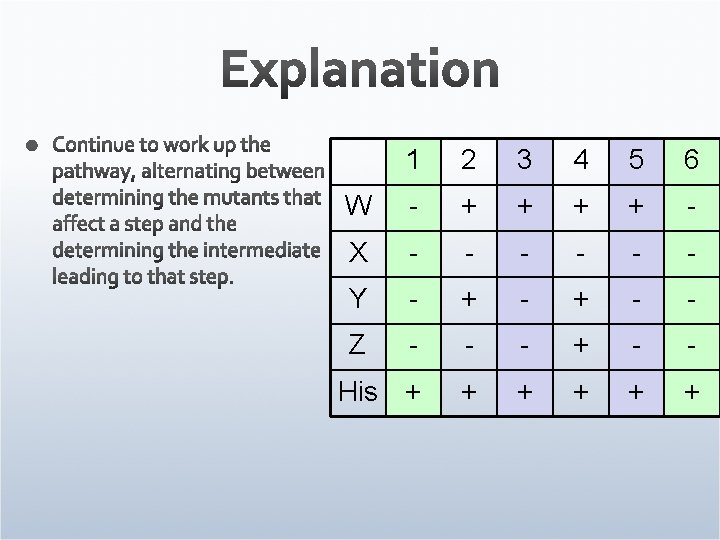 1 2 3 4 5 6 W - + + - X - - - Y - + - - Z - - - + - - His + + + Thus, the pathway so far is W -> His, with 1 and 6 affecting this step.