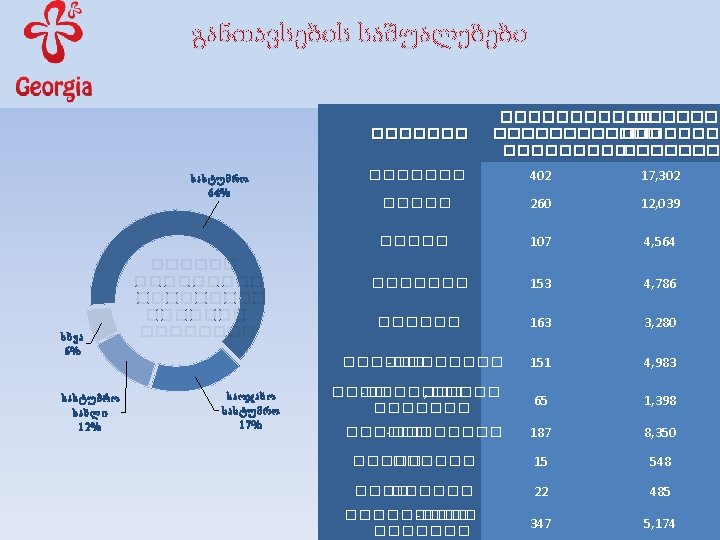 მშენებარე განთავსების საშუალებები ������������ �������� ��������� Intercontinental Rooms Hotel Hilton Garden Inn Radisson Park Inn Rixos Tbilisi Hyatt Regency Moxy by Marriott Radisson BLU Tsinandali Babylon Tower Pullman Hotels & Resort Radisson Blu Gudauri Courtyard by Marriott Radisson BLU Telegraph Ramada Encore (������� ) Ramada Encore (������ ) Golden Tulip Marriott Autograph Collection-Panorama Freedom Square Marriott Autograph Collection-Panorama Sololaki 2017 2018 2017 2017 205 173 165 200 143 170 130 111 168 234 105 150 189 152 125 80 400 346 330 400 340 260 200 336 400 240 300 350 250 190 160 ������� 2018 220 440 ������� 2018 187 400 Tabori Ridge Recreation & Golf Resort ������� 2018 100 200 Best WESTERN VIB Swissotel Le Meridien Marriott Autograph Collection-Hotel & Spa Resort Best Western Plus Princess Hotel ������ 2017 54 180 110 160 320 230 ����� 2016 220 440 ����� 2017 ������ 2017 30 60 146 120 240 250 ������� ��������� ������� ������� სხვა სასტუმროები 125 + 9, 600 + საწოლი 2019 წლის ჩათვლით ჯამში: +150 მეტი განთავსების ობიექტი. +17, 300 მეტი საწოლი ადგილი