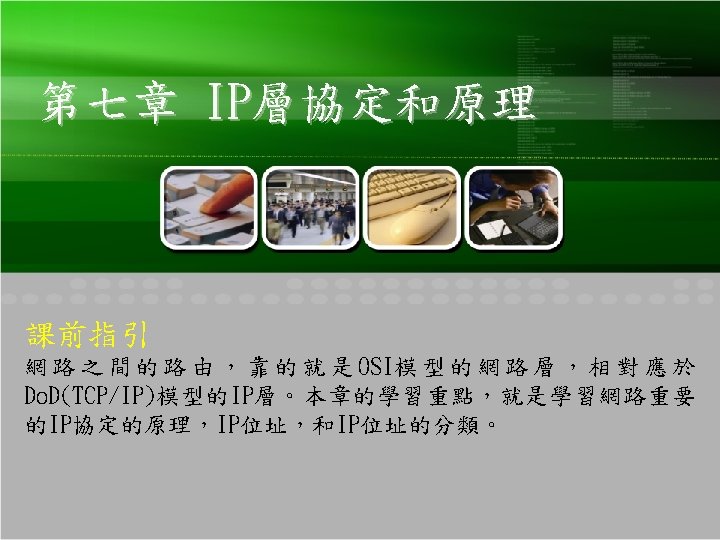 7 -1 網際網路協定 IP三種特性 非連接導向(Connectionless) 不可信賴性(Unreliable) 盡力傳送(Best-Effort Delivery) 9