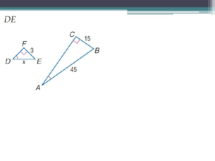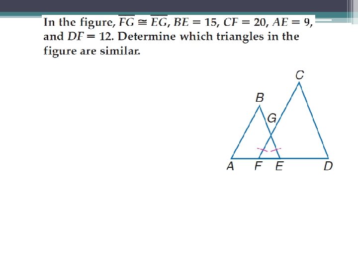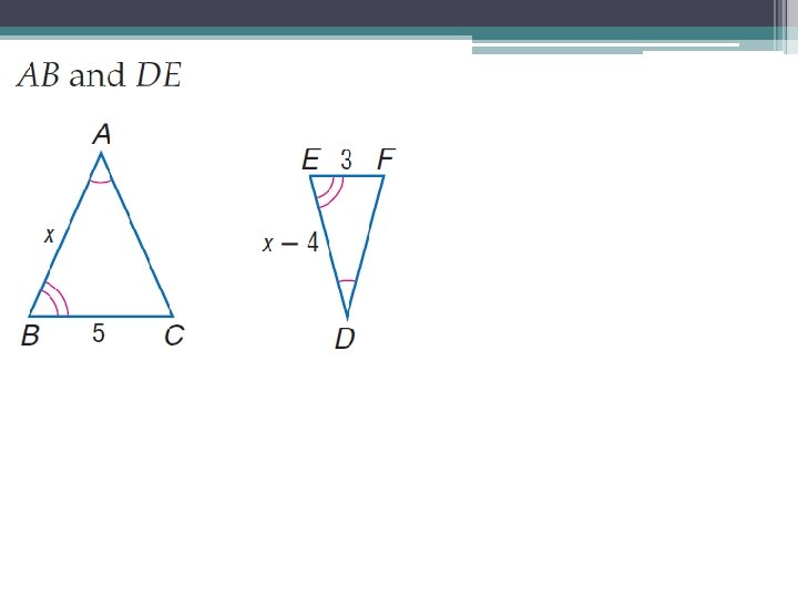 AA Similarity Postulate • If two angles of one triangle are congruent to two angles of another triangle, then the triangles are similar.