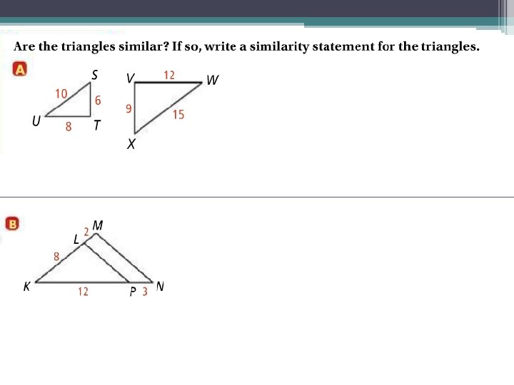 • Use the given lengths to prove that ∆RST ~ ∆PSQ. Given: SP=4, PR = 12, SQ = 5, and QT = 15; S 4 P 12 R 5 Q Prove: ∆RST ~ ∆PSQ 15 T