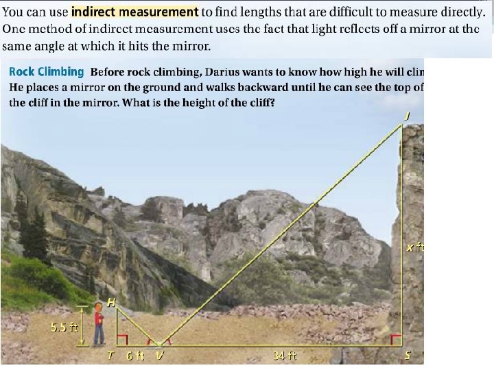 • Nate and Sam are visiting Washington D. C. They want to know the height of the Washington Monument. The monument’s shadow is 111 feet at the same time that Sam’s shadow is 1 foot. Sam is 5 feet tall.