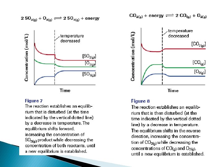 Effect of Temperature on Equilibrium The value of the equilibrium constant changes with temperature, because the forward and reverse reactions are affected Le Châtelier’s Principle still holds. The sign of the enthalpy change for the reaction is important. ◦ Endothermic Change (ΔH >0) ↑ temperature, shift equilibrium to right, forming products & Kc increases ↓ temperature, shift equilibrium to left, forming reactants, & Kc decreases ◦ Exothermic Change (ΔH <0) ↑ temperature, shift equilibrium to left, forming reactants & Kc decreases ↓ temperature, shift equilibrium to right, forming products, & Kc increases