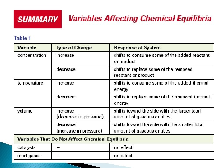 We learned in previous lessons that… • • Law of Chemical Equilibrium • At equilibrium there is a constant ratio between the concentration of reactants and products in any change. Using ICE charts and the equilibrium equation we can solve for the: • Concentrations at: I = initial, C = change, E = equilibrium • Equilibrium constant • Initial or Equilibrium concentrations of chemical species in a reaction • May need to use the quadratic equation to solve problems. • There may be more than one solution, but only one of the solutions will make sense. • The equilibrium constant (K) describes the extent of a reaction. • K > 1 means equilibrium favours the products (more products made than reactants) • K = 1 means at equilibrium there are equal concentrations of products & reactants. • K < 1 means equilibrium favours the reactants (less products made than reactants)