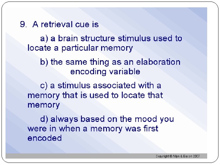 Retrieval Cues Memories are stored in a web of associations Anchor points you can use to target information you want to retrieve later Mneomic Devices Best come from associations we form at the time we encode the memory (5 senses)