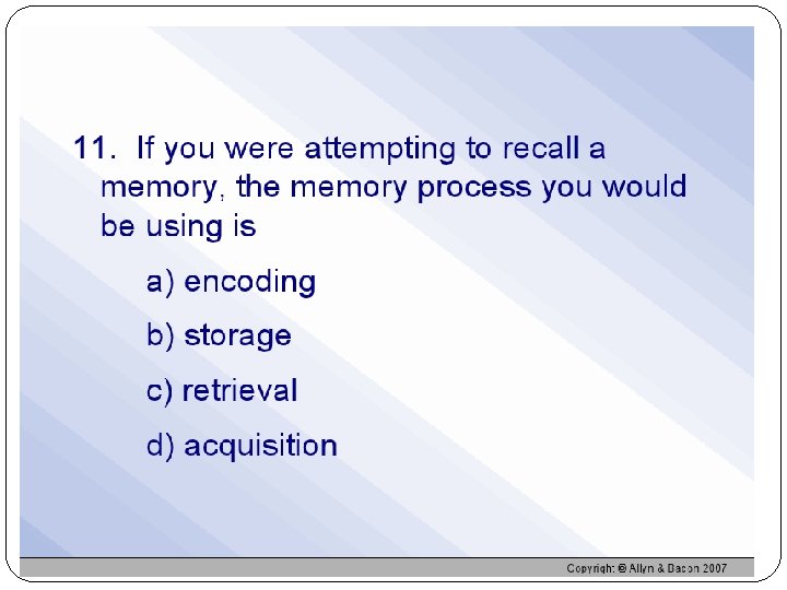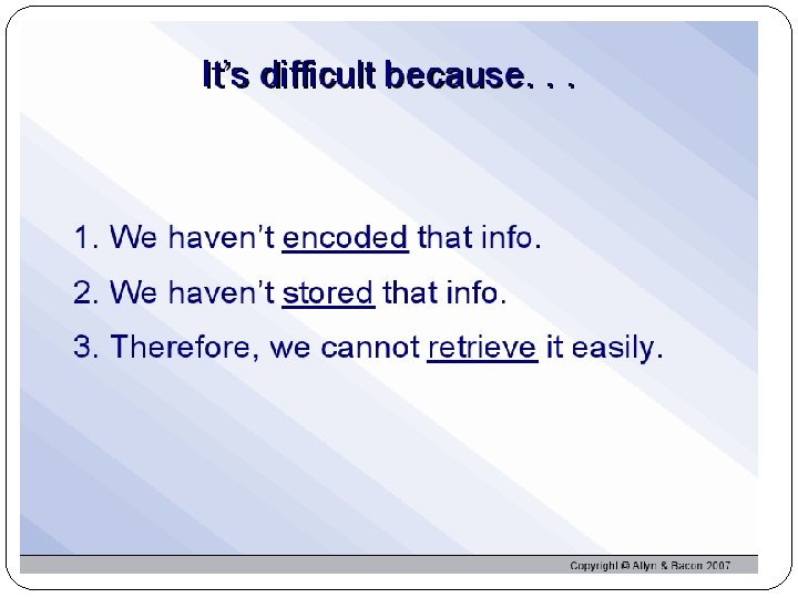 Encoding Failure Age can affect encoding efficiency Helps age-related memories decline Without effort, many memories never form Penny example