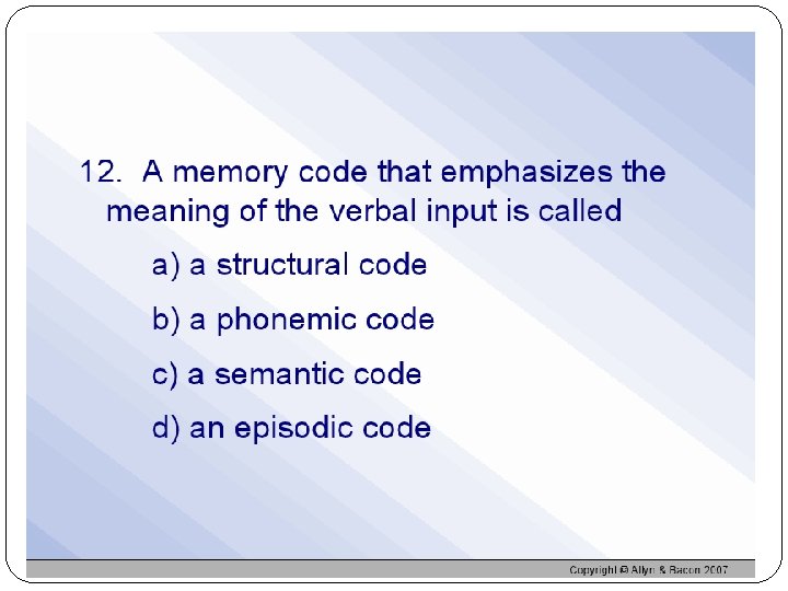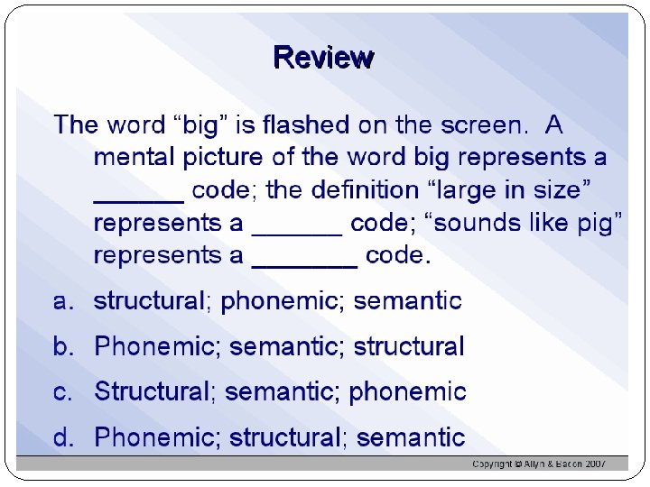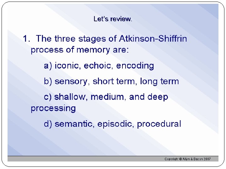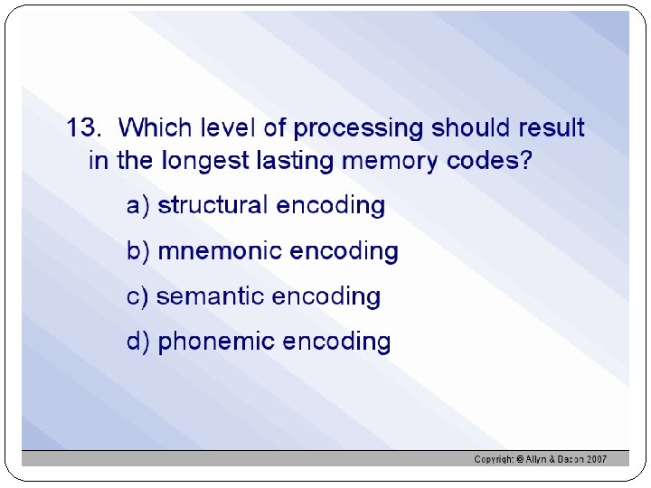 Levels of Processing Visual encoding-picture/images Acoustic encoding-sound Semantic encoding-meaning Processing a word deeply by its meaning produces better recognition later than does shallow processing such as appearance or sound
