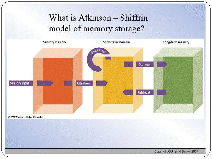 Connectionism Modern Memory model We first record to be remembered info as fleeting: sensory memory From there we process info into short-term memory, where we encode it through rehearsal Information than moves onto long-term memory for later retrieval