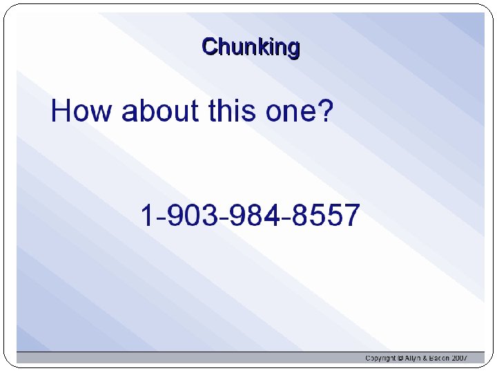 Organizing information for Encoding Chunking: organizing items into familiar units (occurs automatically) Hierarchies: composed of a few broad concepts divided and subdivided into narrower concepts and facts