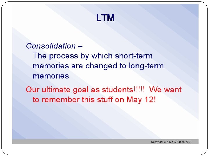 LTP After LTP has occurred, passing an electric current through the brain won’t disrupt old memories, but will wipe out very recent memories Ex: Blow to the head (football players)