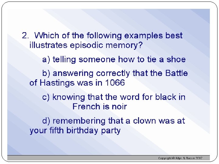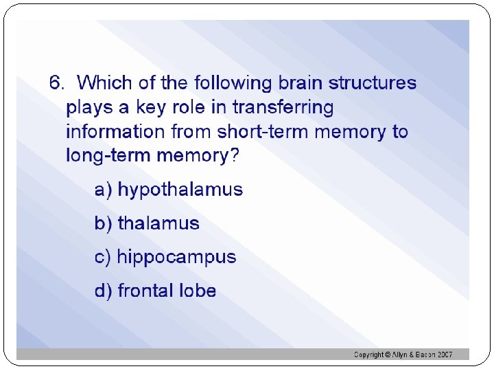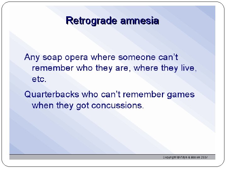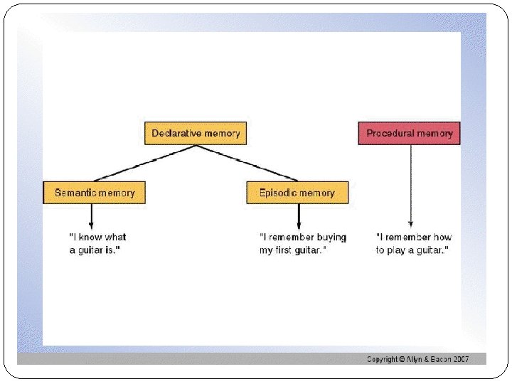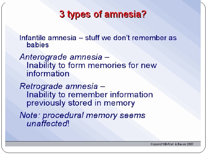 Storing implicit and explicit memories Anmesia: unable to form new memories Destroyed conscious recall not unconscious capacity Implict: “how to do something” Motor skills, bike ridind Explicit: People may not be able to explain how they know to do something
