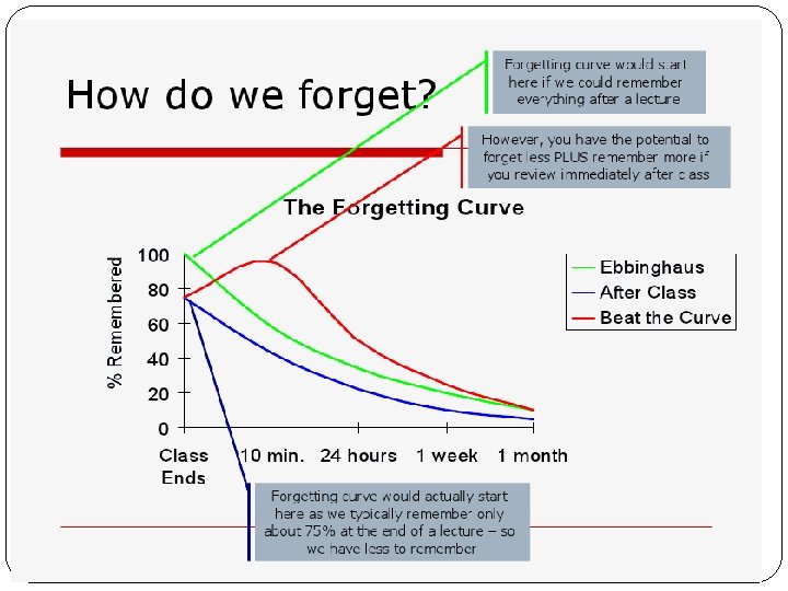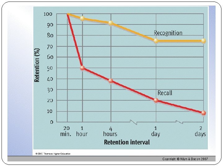 Storage Decay Forgetting Curve: the course of forgetting is initially rapid then levels off with time Why? It is a gradual fading of the physical memory trace Accumulation of learning that disrupts our retrieval