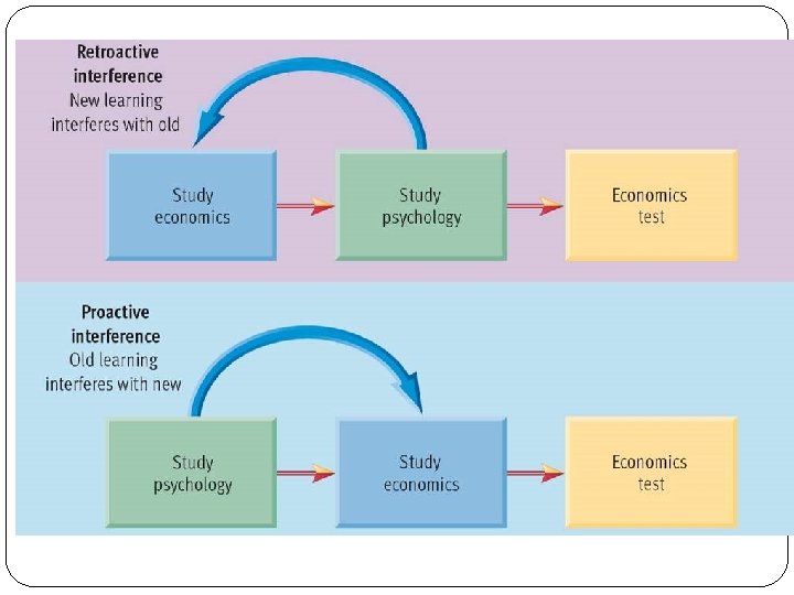 Retrieval Failure: Interference Proactive interference: occurs when something you learned earlier disrupts your recall of something you experience later Retroactive interference: occurs when new information makes it harder to recall something you learned earlier Information presented in the hour before sleep is protected from retroactive inference because the opportunity for interfering evens is minimized When should you study?