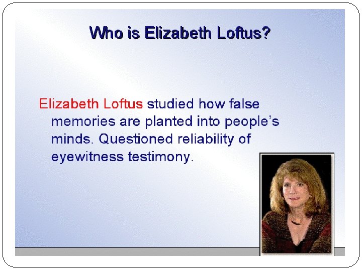 Elizabeth Loftus and Impossible Memories To show that reconstructed memories are not just amalgamations of actual experiences Video clip on AP Collins
