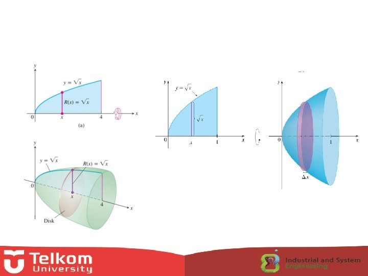 Contoh: Tentukan volume benda putar yang terjadi jika daerah D yang dibatasi oleh , sumbu x, dan garis x = 2 diputar terhadap sumbu x Jika irisan diputar terhadap sumbu x akan diperoleh cakram dengan jari-jari dan tebal Sehingga 2 Volume benda putar