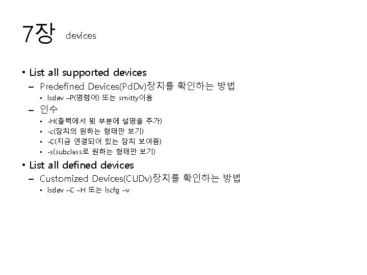 7장 devices • Device states Predefined Database undefined -> supported Device rmdev -dl Predefined Database mkdev –l or cfgmgr • cfgmgr defined -> not usable available -> ready for use – 장치를 재검사하여 ODM를 내용을 갱신하는 명령어 rmdev -l