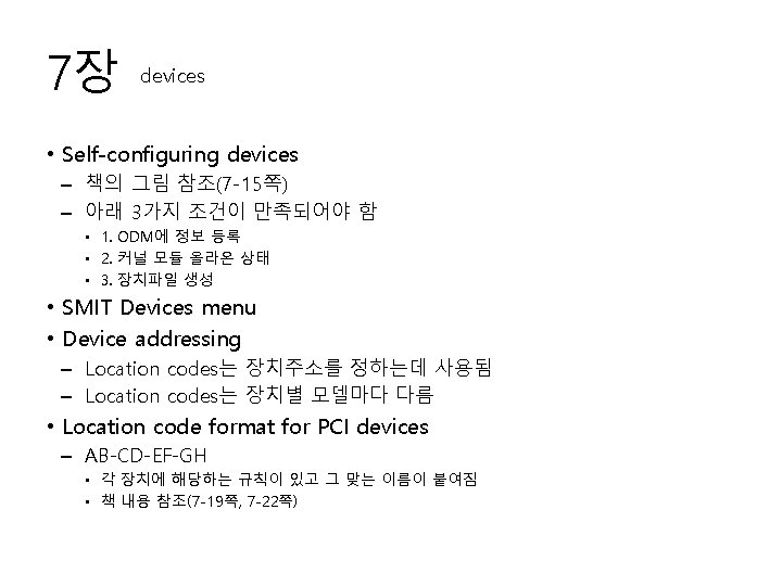 7장 devices • Location code format for SCSI devices – AB-CD-EF-G, H – 책의 내용 참조(7 -24쪽, 7 -26쪽) • Physical location codes – 시스템 펌웨어가 할당해줌 – Physical location codes구조 • <enclosure>. <planar>. <slot>-<port>-<logical location> – lscfg, lsdev명령어을 이용해 내용을 볼 수 있음 • Listing device physical locations – lsdev 명령(예>lsdev –C –H –F “name status”)을 이용해 볼 수 있음 • Adding an ASCII terminal – ASCII terminal은 cfgmgr명령어로 못 잡으므로 smitty tty에서 추가해주어 야함