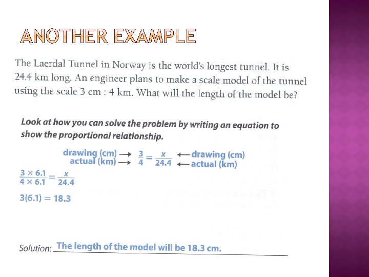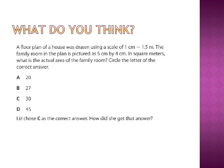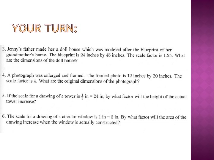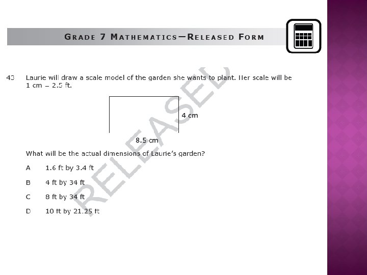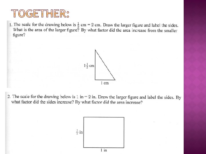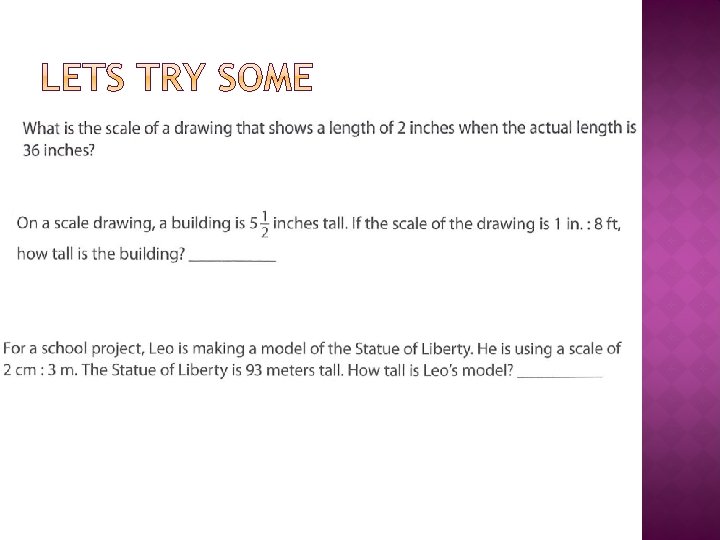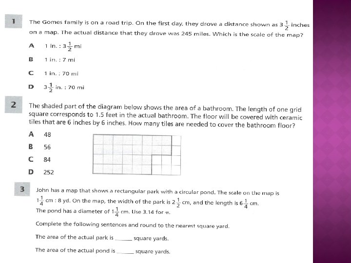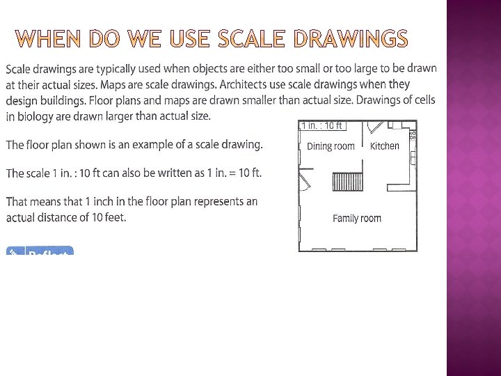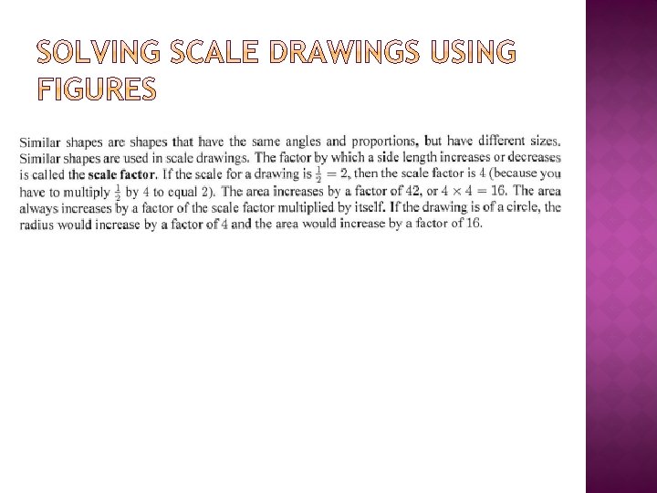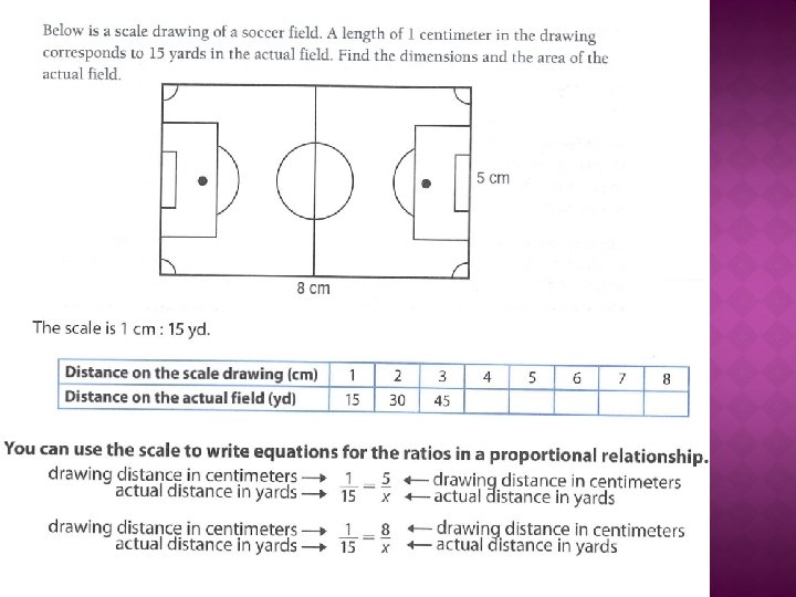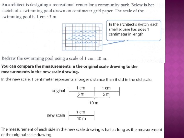 � Understand that a scale is ratio. � Computer actual lengths from a scale drawing involving geometric figures. � Compute actual areas from a scale drawing involving geometric figures. � Reproduce a scale drawing using a different scale. � Determine the scale of a drawing given the ratios of lengths and areas in the drawing and the actual dimensions