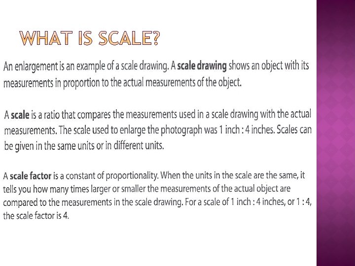 • SCALE DRAWING – a drawing that shows an objet with its measurement in proportion to the actual measurements of the object. • SCALE: a ratio that compares the measurements used in a scale drawing with the actual measurements. • SCALE FACTOR: a constant of proportionality