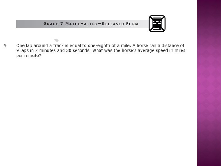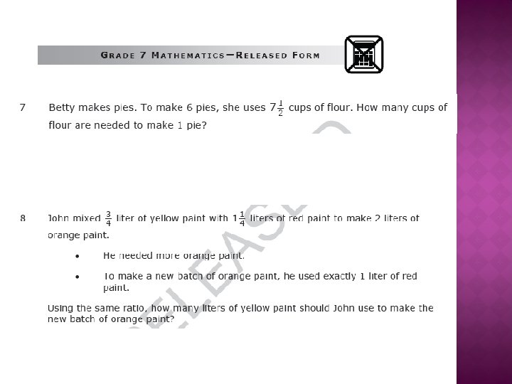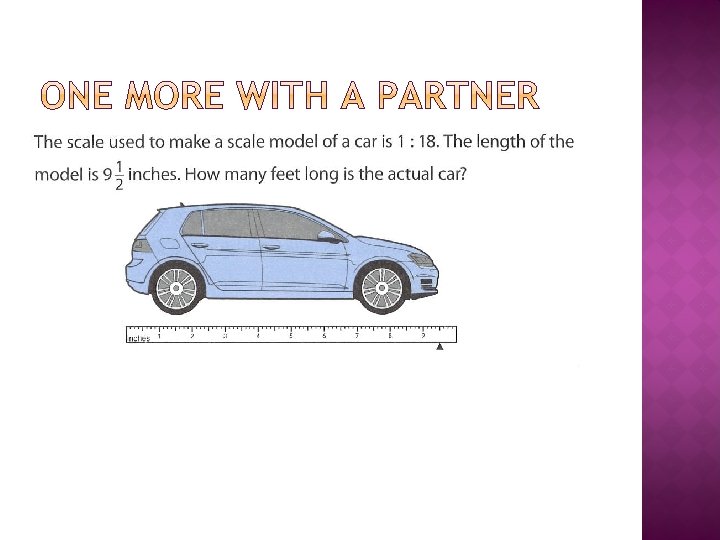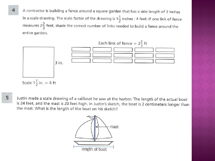 7. G. 1 Solve problems involving scale drawings of geometric figures, including computing actual lengths and areas from a scale drawing and reproducing a scale drawing at a different scale 7. RP. 1 Compute unit rates associated with ratios of fractions, including ratios of lengths, areas and other quantities measured in like or different units. For example, if a person walks 1/2 mile in each 1/4 hour, compute the unit rate as the complex fraction (1/2)/(1/4) miles per hour, equivalently 2 miles per hour