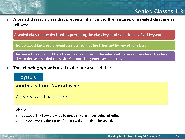 Sealed Classes 1 -3 u A sealed class is a class that prevents inheritance. The features of a sealed class are as follows: A sealed class can be declared by preceding the class keyword with the sealed keyword. The sealed keyword prevents a class from being inherited by any other class. The sealed class cannot be a base class as it cannot be inherited by any other class. If a class tries to derive a sealed class, the C# compiler generates an error. u The following syntax is used to declare a sealed class: Syntax sealed class<Class. Name> { //body of the class } where, ² ² © Aptech Ltd. sealed: Is a keyword used to prevent a class from being inherited. Class. Name: Is the name of the class that needs to be sealed. Building Applications Using C# / Session 7 39