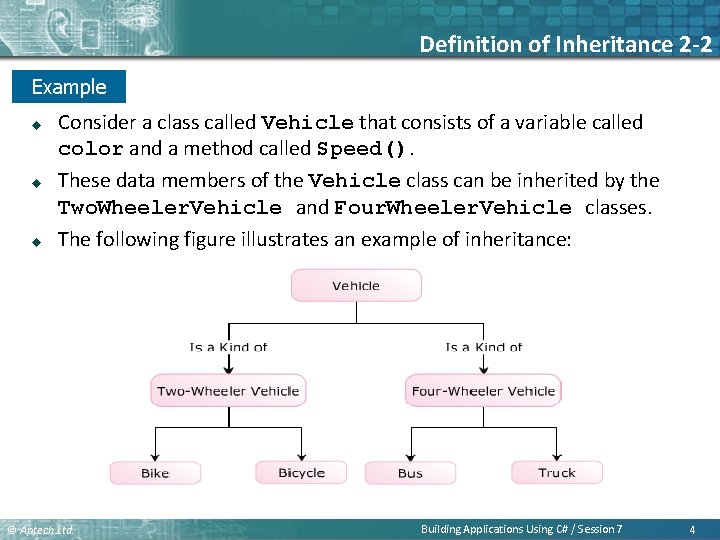 Definition of Inheritance 2 -2 Example u u u Consider a class called Vehicle that consists of a variable called color and a method called Speed(). These data members of the Vehicle class can be inherited by the Two. Wheeler. Vehicle and Four. Wheeler. Vehicle classes. The following figure illustrates an example of inheritance: © Aptech Ltd. Building Applications Using C# / Session 7 4