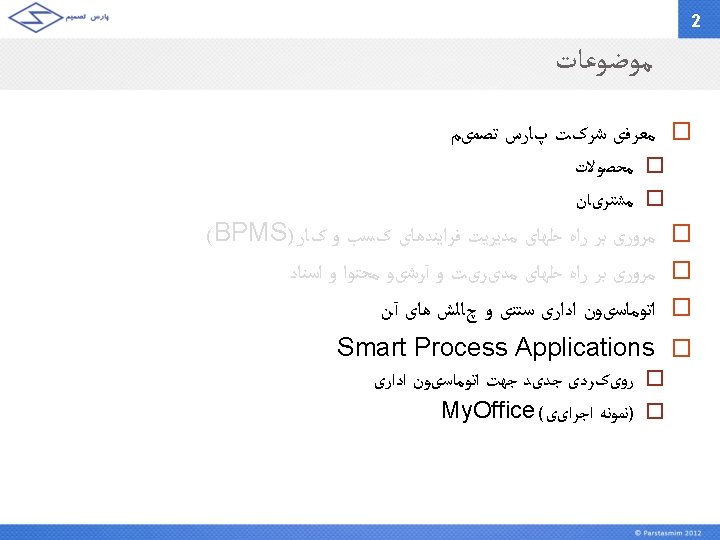 11 My. Office Key Features �A Google like search engine provides user friendly interface for end-users to easily find what they are looking for. �Comes with 100 out-of-the-box processes, enables business personnel to easily configure processes and generate new ones. �Support multi platforms like Web, Mobile, SMS, MMS and USSD. �Easily Integration with other Business Systems. �Fully integrated with Share. Point portal. �Manage user KPIs in different processes. ©Pars. Tasmim 2014 9/15/2020