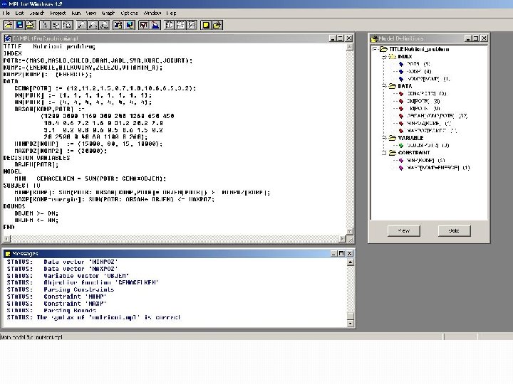 Prostředí systému MPL for Windows �okno, do kterého se zapisuje vlastní model – toto okno je označeno jménem souboru, které má typicky příponu. mpl, �okno Model Definitions, ve kterém je zobrazena struktura modelu (proměnné, omezující podmínky, parametry apod. ), �okno Messages, které obsahuje zprávy o průběhu řešení.