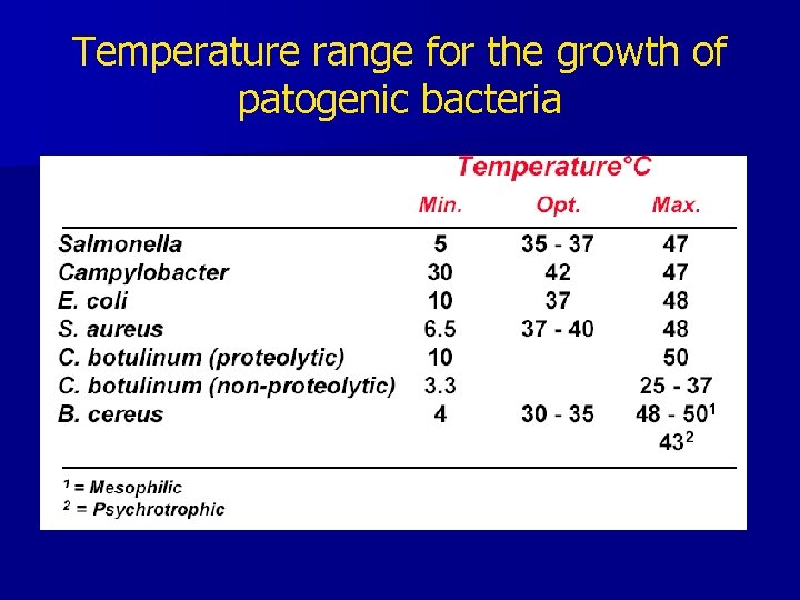 Example: 1. Salmonella • Causing Salmonellosis • Main symptoms: diarrhea, fever, vomiting, abdominal cramps. • Persons at high risk: young, old, pregnant woman, underlying disease states. • Incubation period: 12 – 36 h • Sources: meat, poultry, milk, eggs, vegetables, shellfish, spices and herbs, untreated water. • Salmonella is heat sensitive • Pasteurization (70 o. C for 2 min) is sufficient to kill Salmonella in high moisture foods.