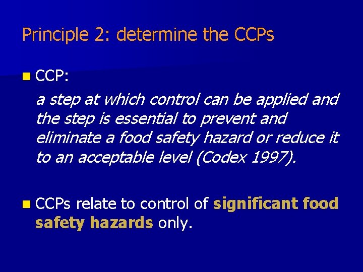 Principle 2: determine the CCPs n CCP: a step at which control can be applied and the step is essential to prevent and eliminate a food safety hazard or reduce it to an acceptable level (Codex 1997). n CCPs relate to control of significant food safety hazards only.