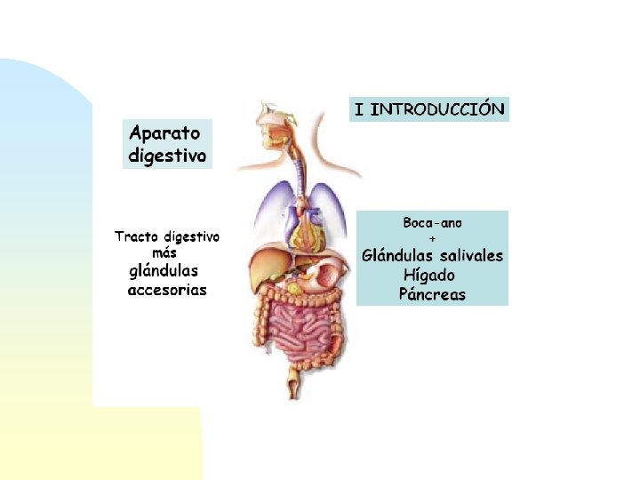 Morfología del aparato digestivo Comida Gland. salivares 5 m Boca Esófago Estómago Intestino delgado Hígado • Duodeno páncreas • Yeyuno • Íleon Intestino grueso Heces boca Gland. salivares Esófago Hígado Estómago Vesícula biliar duodeno Cólon ascendente Apéndice Intestino delgado Ano Páncreas Cólon transverso Cólon descendente Recto