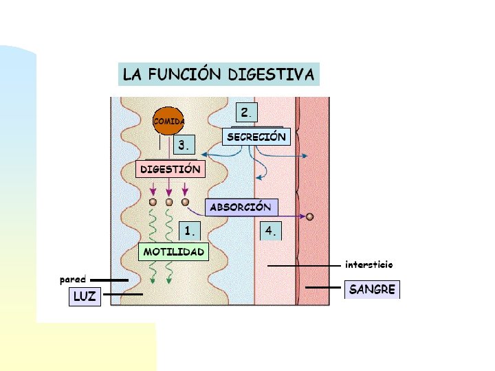 FUNCIONES Motilidad Secreción Digestión Absorción + Circulación CONTROL entre partes del tracto GI + CONTROL entre partes y centros nerviosos superiores • Mensajes eléctricos SN entérico SN autónomo • Mensajes hormonales SE entérico SE sistémico