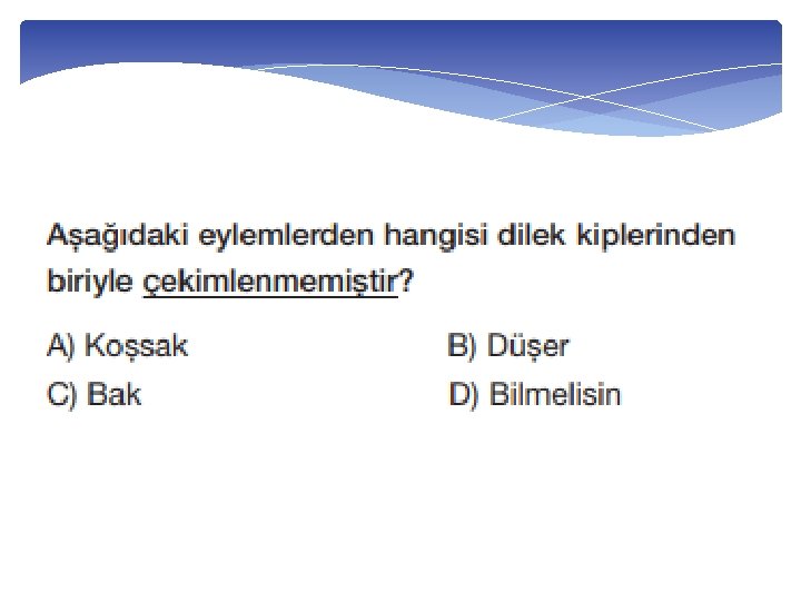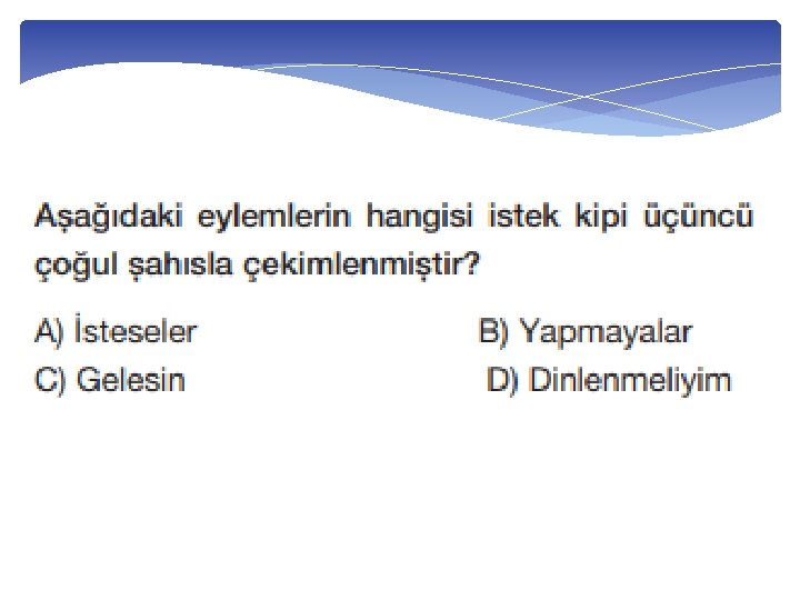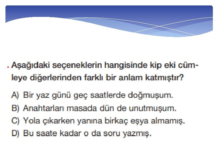 7. Sınıf Fiilde Kip Haber / Zaman / Bildirme Kipleri • Görülen Geçmiş Z. (-dı) • Duyulan Geçmiş Z. (mış) • Şimdiki Z. (-yor/ -makta) • Gelecek Zaman (-ecek) • Geniş Zaman (-ar/-maz) Dilek Kipleri • Gereklilik Kipi (-malı) • İstek Kipi (-e, -a) • Dilek-Şart Kipi (-se, -sa) • Emir Kipi
