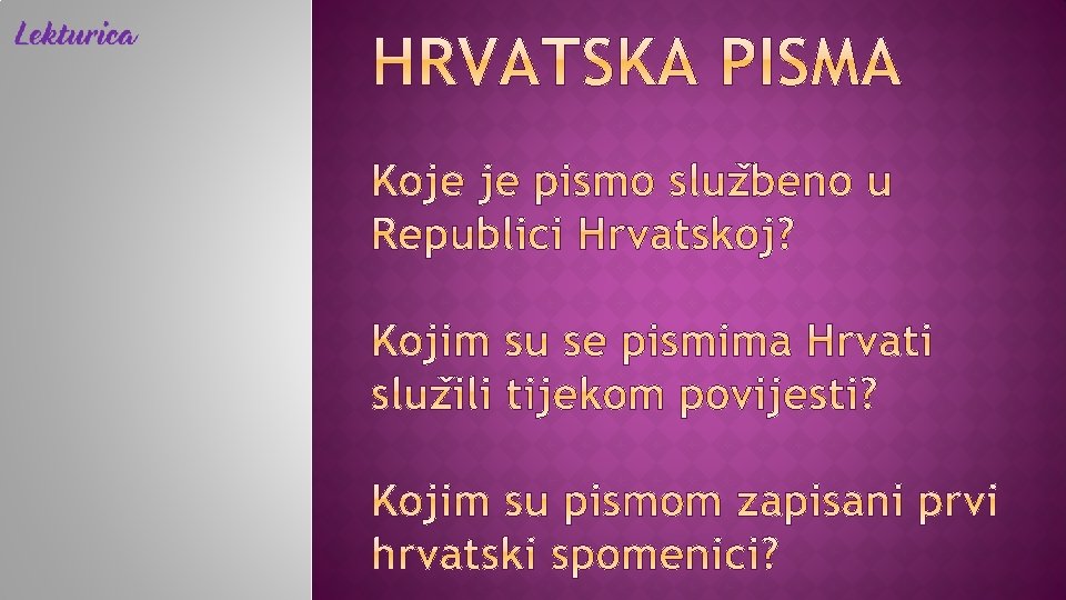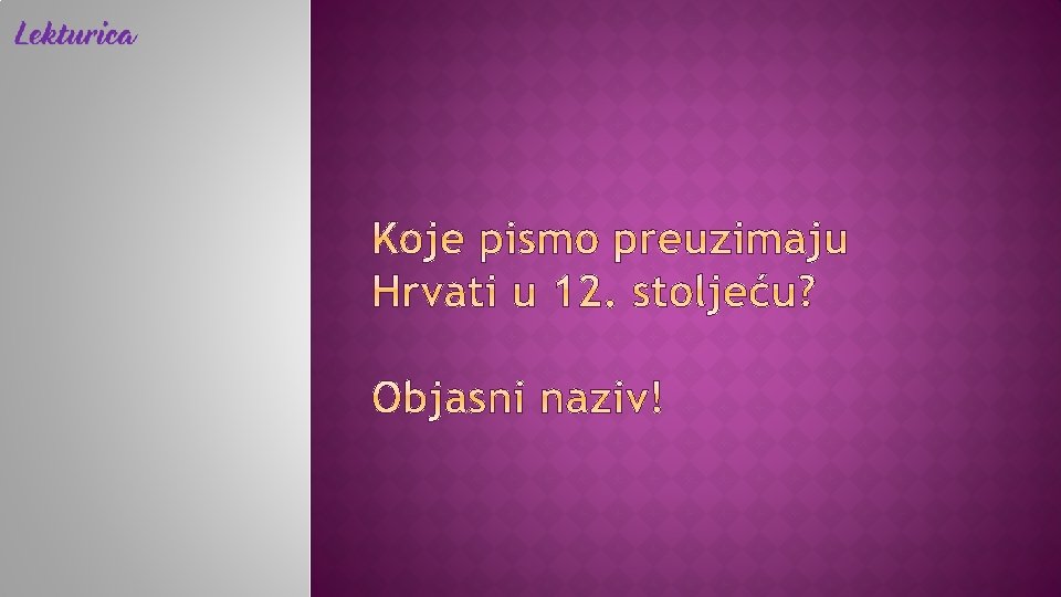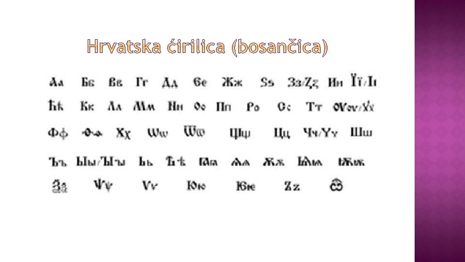 12. st. − Hrvati preuzimaju ćirilicu hrvatska inačica: hrvatska ćirilica, bosančica najraširenija u južnim hrvatskim krajevima (okolica Splita, Dubrovnik, Brač) i u Bosni najstariji sačuvani spomenici: Povaljski prag Povaljska listina nazivi: ĆIRILICA − pismo su u 9. st. osmislili Ćirilovi (Konstantinovi) učenici i u čast svome učitelju nazvali ga ćirilicom BOSANČICA − rabila se u južnim hrv. krajevima i Bosni; to je hrvatsko narodno pismo!