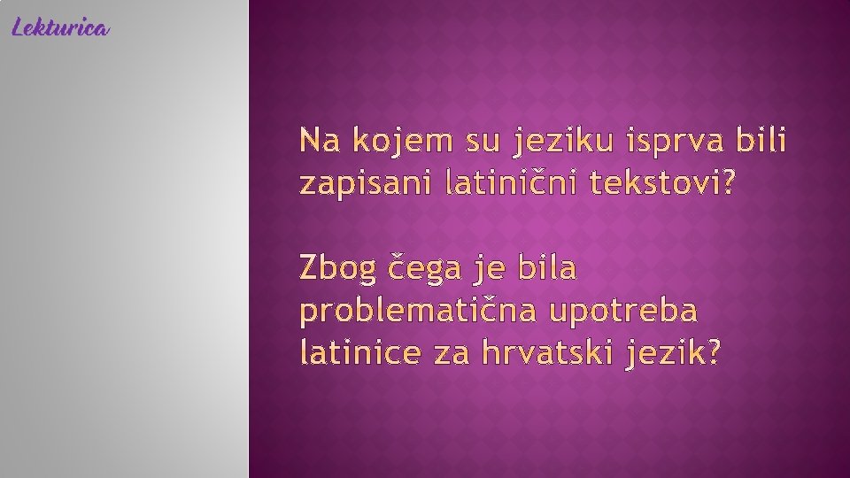 7. st. − dolazak Hrvata na današnje prostore prihvaćanje kršćanstva, time i latinskog jezika i latinice nastanak i razvoj pismenosti u okrilju Crkve širenje pismenosti i na svjetovna područja života najstariji sačuvani spomenici: Natpis kneza Trpimira Natpis kneza Branimira dokaz da su latinica i latinski jezik bili u službenoj upotrebi